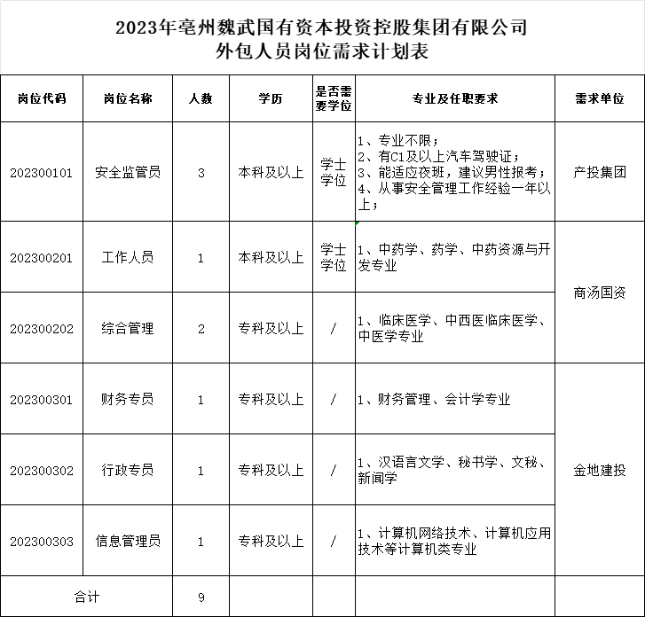 因工作需要,現(xiàn)委托亳州市譙騰人力資源管理有限公司面向社會招聘外包崗位人員9名;現(xiàn)將有關(guān)招聘事宜公告如下: