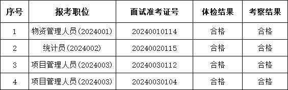 根據(jù)《2024年亳州恒鑫建筑工程設(shè)備租賃有限公司外包人員公開招聘》相關(guān)規(guī)定,現(xiàn)將擬入圍對象體檢、考察結(jié)果公示如下: